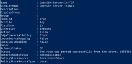 | > New-NetFirewallRule -Name 'OpenSSH-Server-In-TCP' -DisplayName 'OpenSSH Server (sshd)' -Enabled True -Direction Inbound -Protocol TCP -Action Allow -LocalPort 22 |